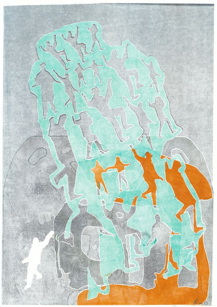 und während sie denken vielleicht 8. September 2023 708 × 1000 133 Projektgruppe Druckkunst Bergisch Land Ulla Riedel, 2023, Schablonendruck
